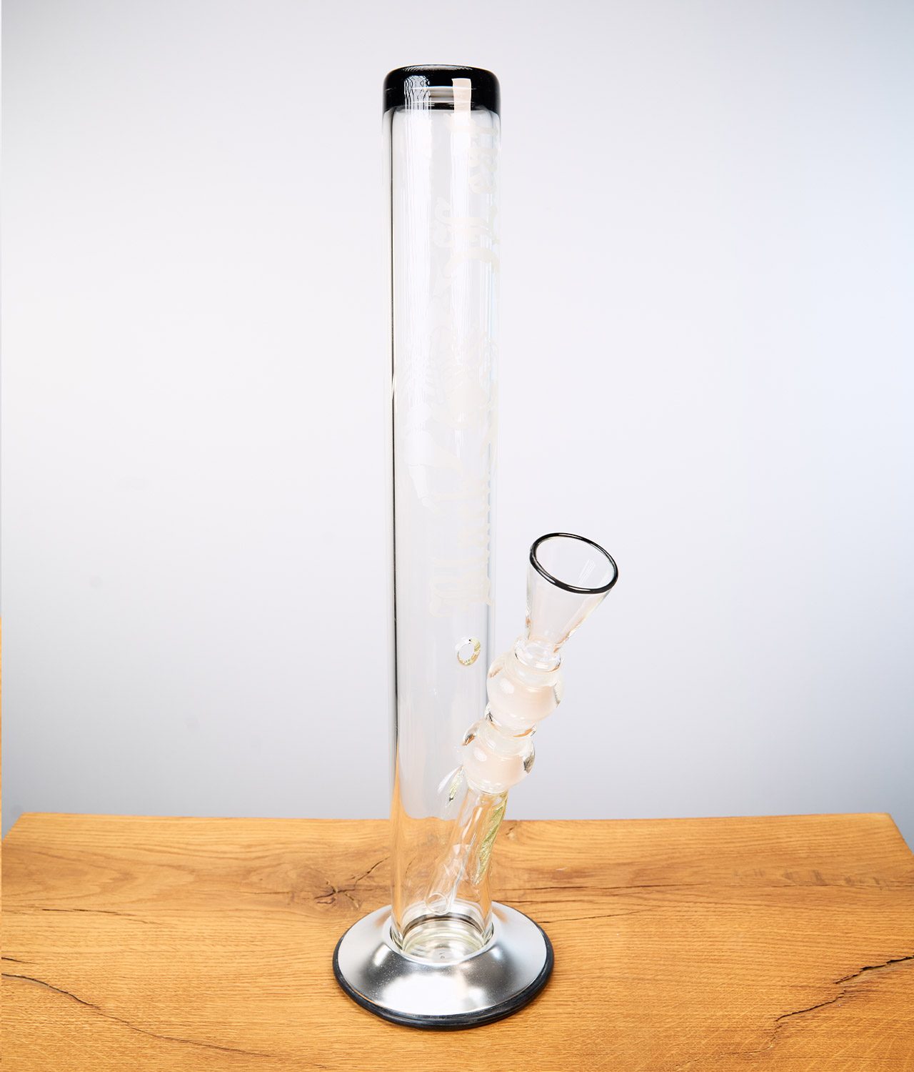 Die schwarz akzentierte Glasbong Scorpion von Black Leaf auf Holz
