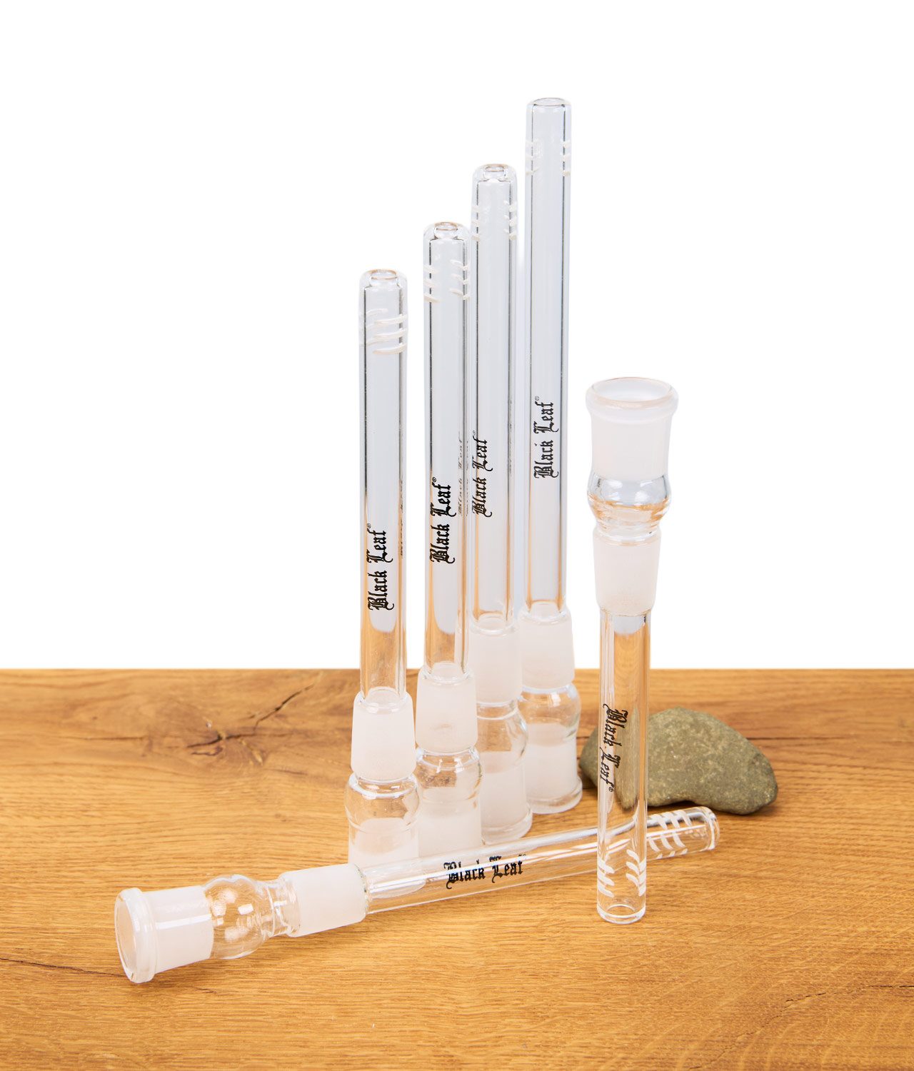 Black Leaf Schlitzdiffusor Chillum – Adapter aus hitzebeständigem Borosilikatglas mit NS19-Innen- und -Außenschliff. Sechs präzise Schlitze am Fuß verwirbeln den Rauch & kühlen spürbar ab. Erhältlich in sieben Längen von 120 mm bis 180 mm, jeweils mit schwarzem Black-Leaf-Logo.
