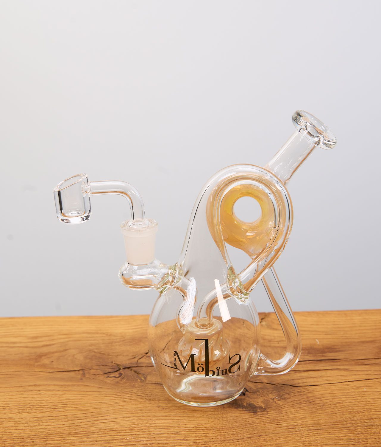 Die Blaze Recyclerbong Möbius vereint ein einzigartiges Flasche-in-Flasche-Design mit starker Funktion: Der Schlitzperkolator wirbelt Wasser und Rauch intensiv auf, wodurch der Dampf angenehm gekühlt und gefiltert wird. Dank der Recycler-Bauweise wird das Wasser effizient durch die Kammern geleitet, ohne den Luftzug zu stören. Die Bong besteht aus klarem Borosilikatglas mit NS14-Schliff, ist 17 cm hoch und setzt durch den bernsteinfarbenen Akzent optische Highlights. Passend dabei: Ein Quarzbanger fürs Dabbing.