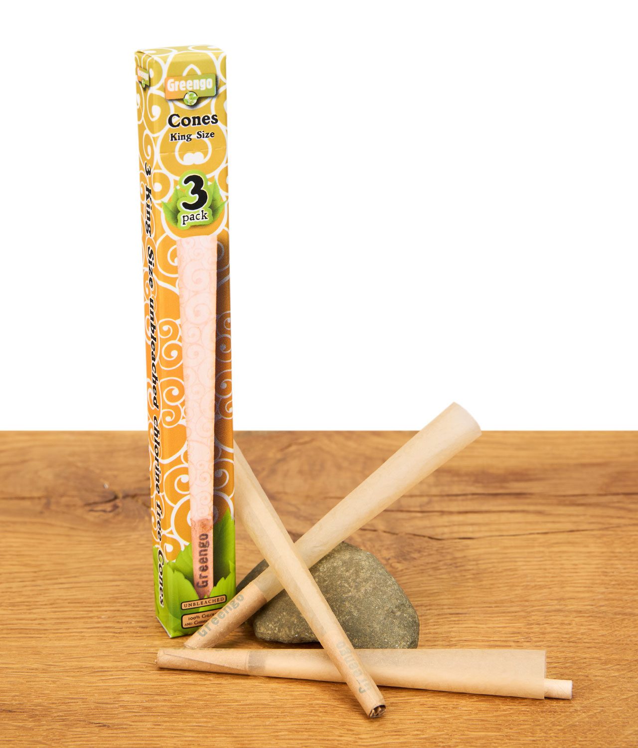 Greengo Cones King Size 3er Pack mit ungebleichten Cones vor Stein auf Holzuntergrund.