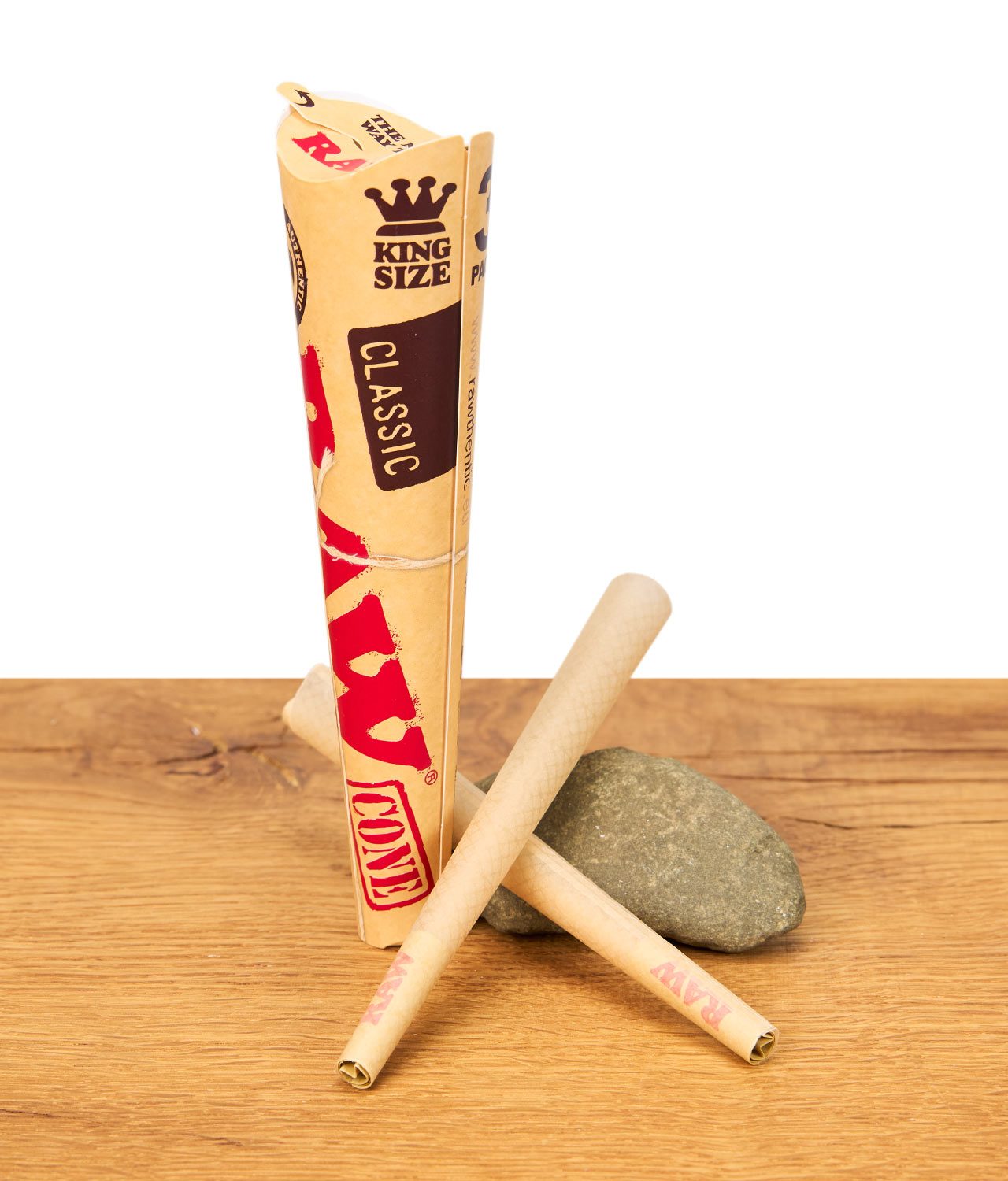 Die RAW Cones King Size 3er Pack enthält 3 vorgedrehte Cones aus ungebleichten Pflanzenfasern. Mit einer Länge von 110mm sind sie ideal für King Size Liebhaber und sorgen für einen sauberen, langsamen Abbrand dank des typischen RAW Wasserzeichens. Die Füllmenge ist ca. 0,7 bis 1,0g
