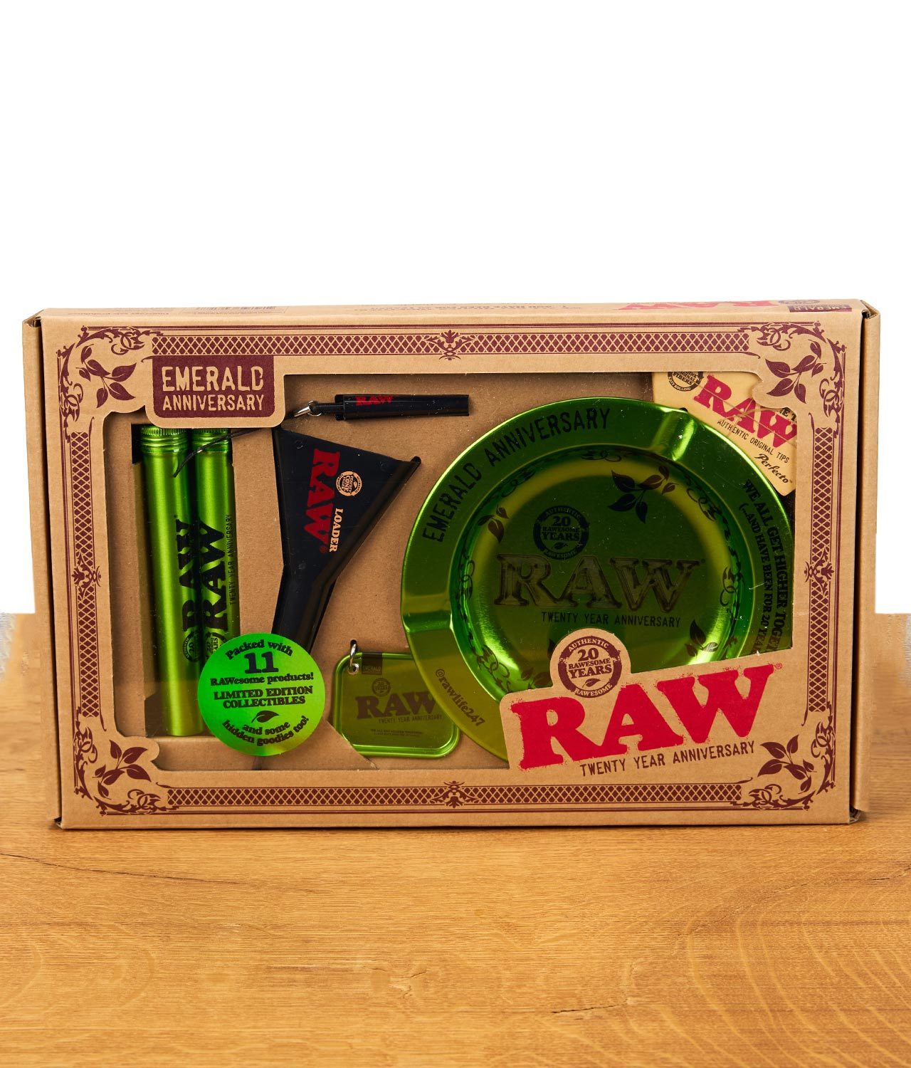 RAW Emerald Anniversary Giftset Verpackung mit grünem Aschenbecher, Tube, Schlüsselanhänger und Zubehör in einer limitierten Jubiläumsbox, auf Holzoberfläche.