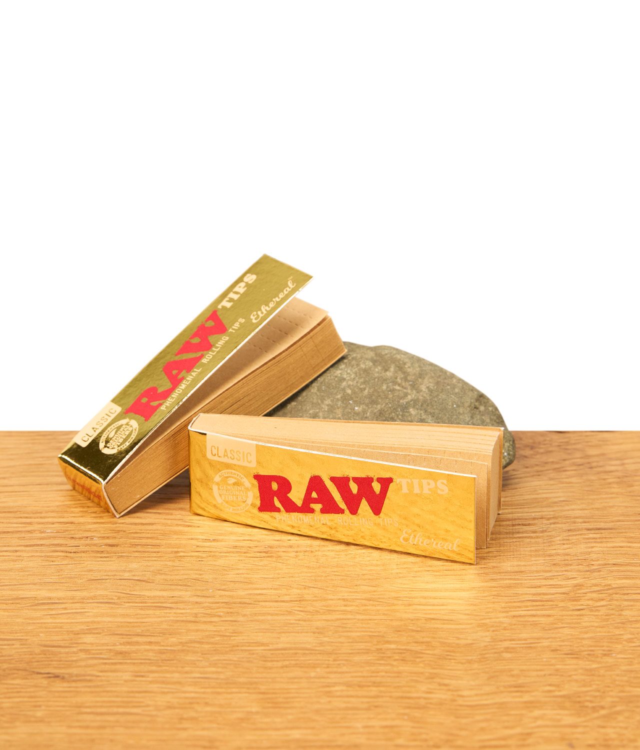 RAW Ethereal Classic Filter Tips, goldene und naturfarbene Verpackungen auf Holz neben Stein, Zubehör für Rolling Papers.