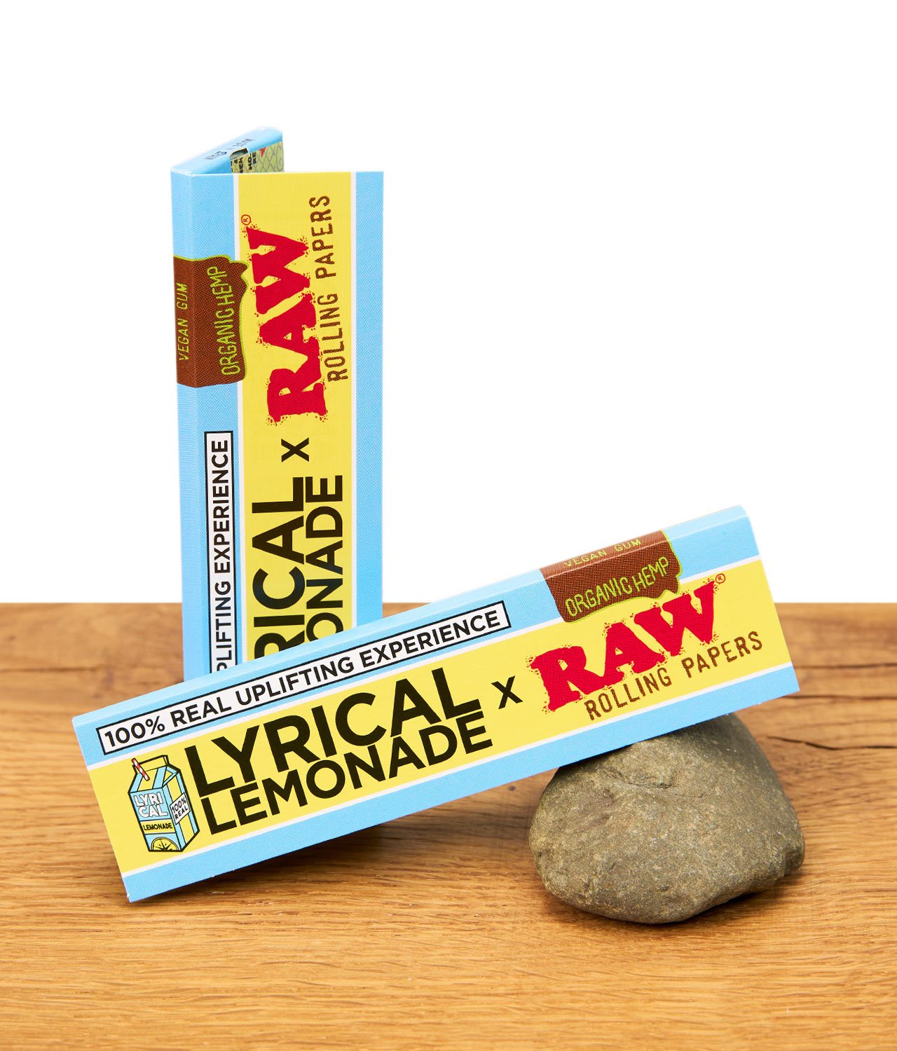 RAW x Lyrical Lemonade Rolling Papers mit veganem Gummi und organischem Hanf auf Holztisch, Verpackung im Fokus.