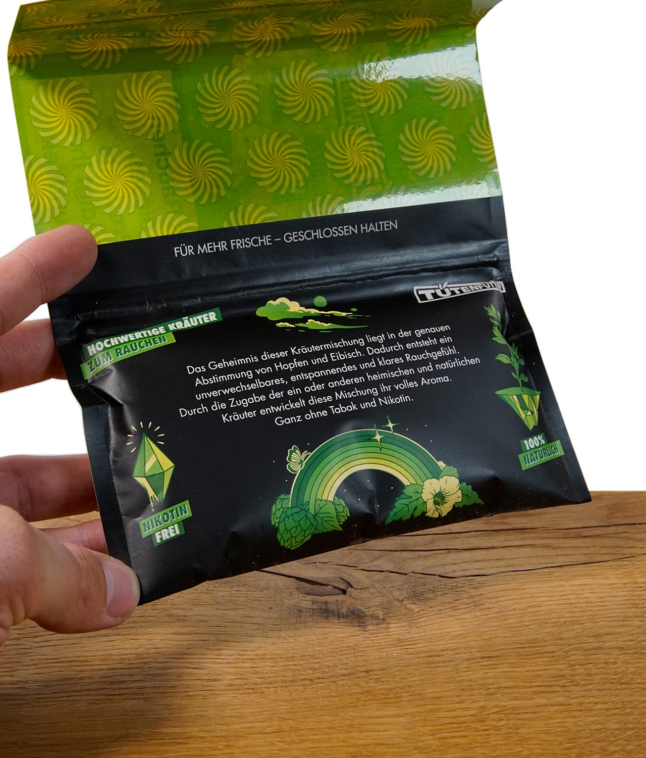 Die Edition Tütenfutter Green setzt auf eine andere aromatische Ausrichtung. Das Geheimnis dieser Mischung liegt in der genauen Abstimmung von Hopfen und Eibisch. Diese Kombination soll ein unverwechselbares, entspannendes und klares Rauchgefühl erzeugen. Auch hier wird die Mischung durch weitere heimische und natürliche Kräuter ergänzt, um das volle Aroma zu entfalten. Tütenfutter Green wird oft als sehr mild im Aroma beschrieben und eignet sich hervorragend zum Mischen und zum Hervorheben des Geschmacks deiner Kräuter.